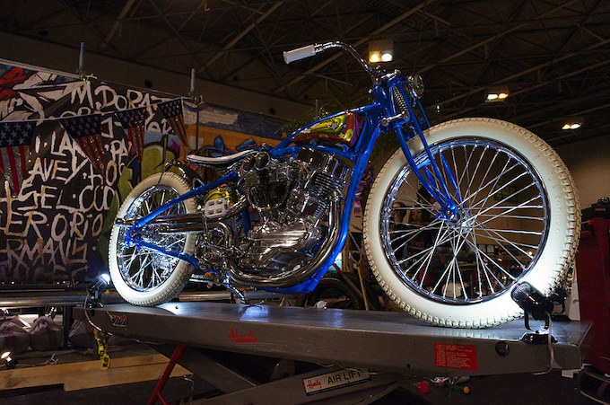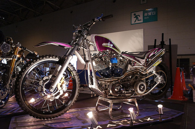 手の凝ったフューエルタンクにエッジを際立たせるスキャロップ調のデザインを配している。さらにBMX風のハンドルなど見所満載。