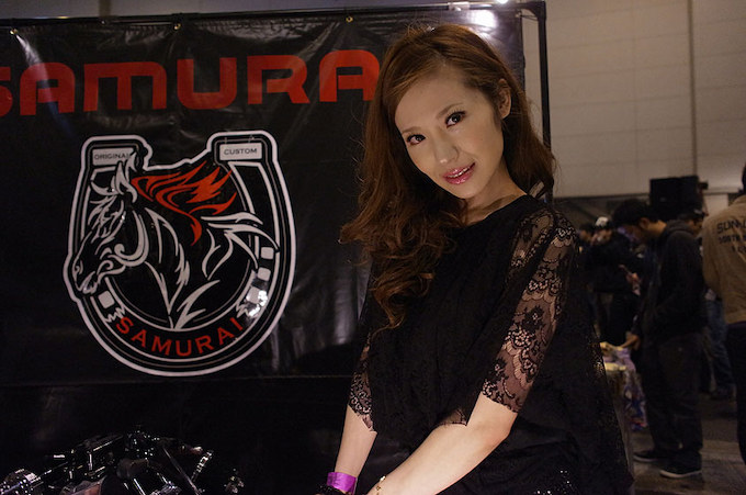 カスタムショーの華、女性コンパニオンをピック。男性だけではなく、女性来場者からも高い注目を集めていた。