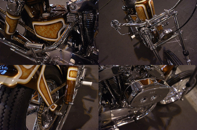 A-syksの手によるショベルチョッパー。純正4速フレームを生かした定番のフォルムであるが、それゆえに個性を出すことが難しい車両と言える。