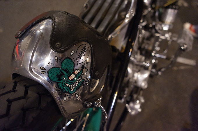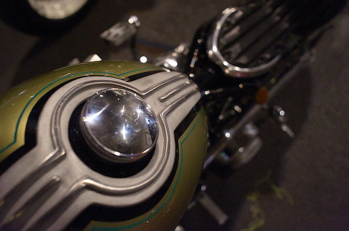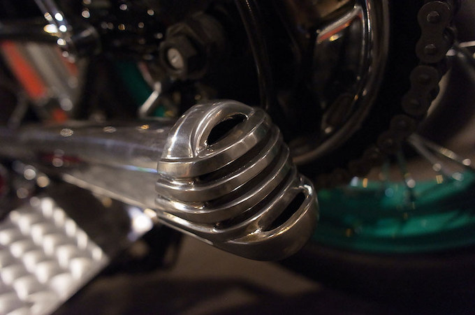 HOT CHOPの十八番、鋳物で製作されたタンクパネル。ライムグリーンのシンプルなペイントゆえに映えるディテイルと言える。
