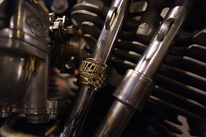 ステッカー代わりに使えるHOT CHOPオリジナルリングをプッシュロッドに装着。さりげない演出であるが、存在感は大きい。
