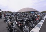 願いが届いたのか、当日はそれまでの悪天候がウソのようなおだやかな空模様。会場の並木道には散らずに残ってくれていた桜が咲き誇り、絶好のロケーションとともに私たちを出迎えてくれました。開催の10時前から続々とオーディエンスが会場入りし、570台ものスポーツスターが駐車場を埋め尽くしたのです。