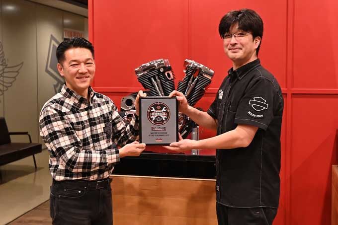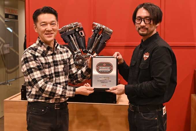 ここでテクニシャンオブザイヤーアワード2023を獲得したハーレーダビッドソン山口の藤津 光さんの表彰式も行われた。おめでとうございます!