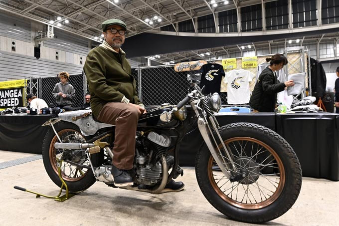 キャンプシーンを牽引するOLD MOUNTAINのブースに展示されたSVチョッパー。手掛けたのはチャボエンジニアリングの木村さんで、往年のゼロスタイルが目を引く一台である。