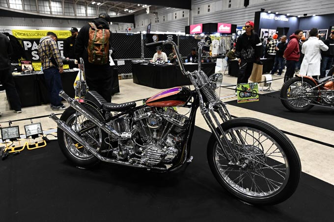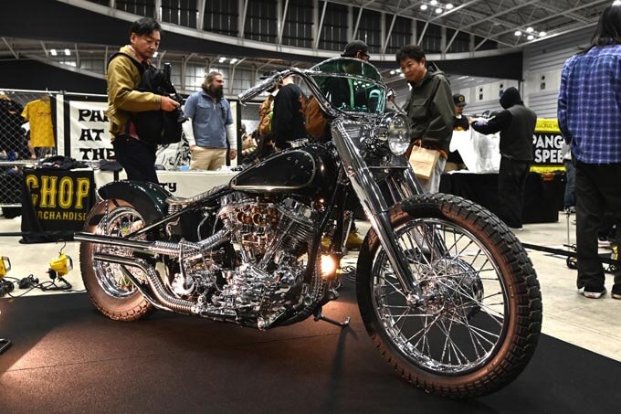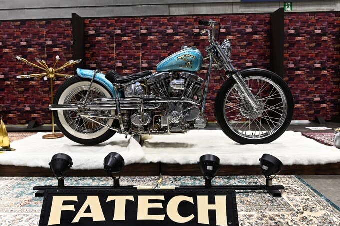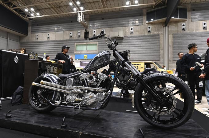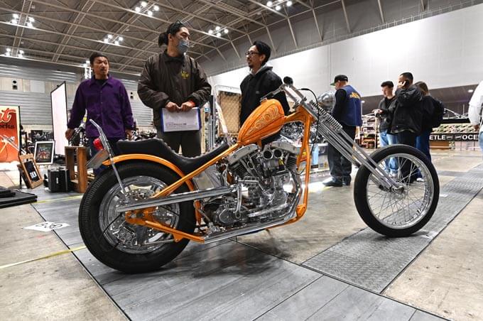 ここからは出展されたカスタムマシンをご紹介。こちらはURAWUSが持ち込んだショベルスポーツとショベルヘッドの2台のチョッパー。均整の取れたスタイリングに隙のない作り込みが見応えのあるマシンだ。