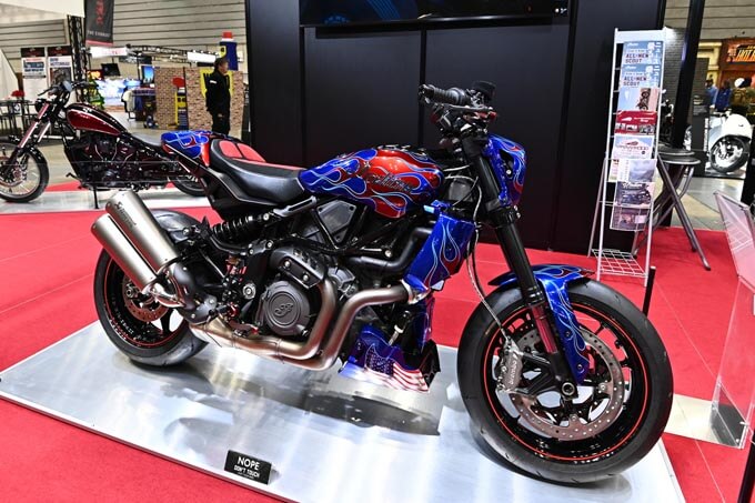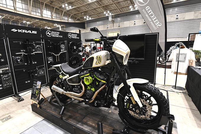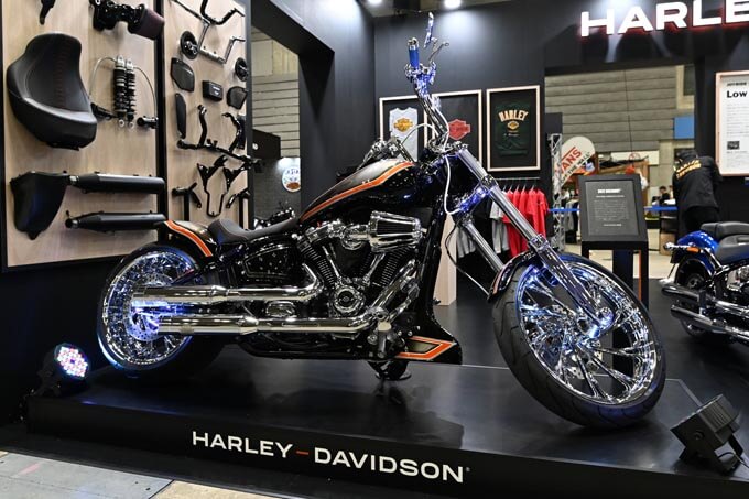 ブースにはハーレーダビッドソン南大阪が製作した2022年式ブレイクアウトカスタムが展示。エクステリアはドイツのサンダーバイク製で、各部の徹底したクロームがこだわりとなる。