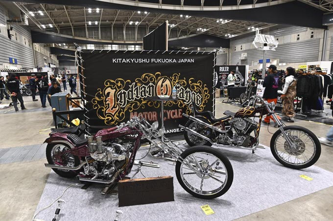 北九州のインディアンオレンジは2台のマシンを持ち込んだ。オーセンティックなショベルチョッパーにスーパーチャージャーを装備したアイアンディガー!