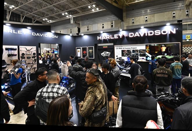 ここからはオフィシャルスポンサーのハーレーダビッドソンブースをご紹介。ご覧のように終始人垣が絶えることはなかった。