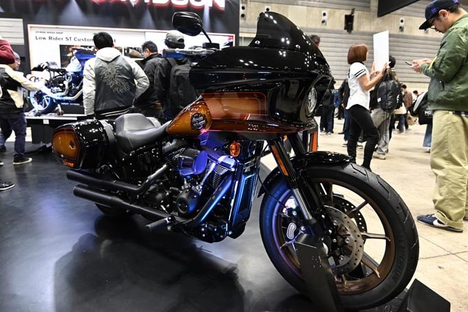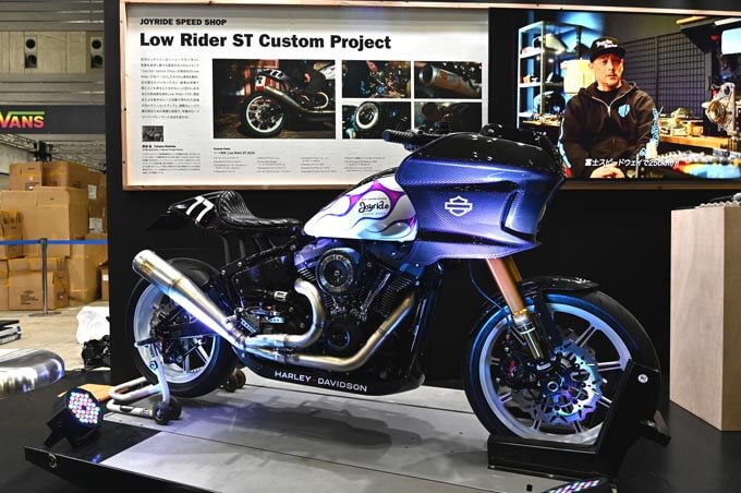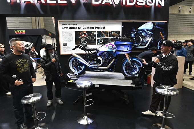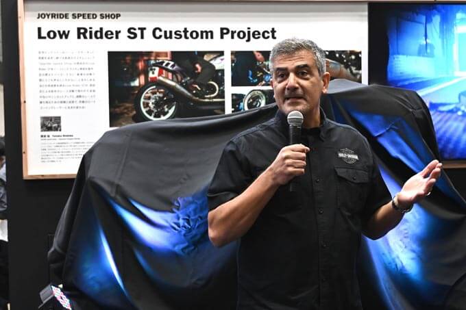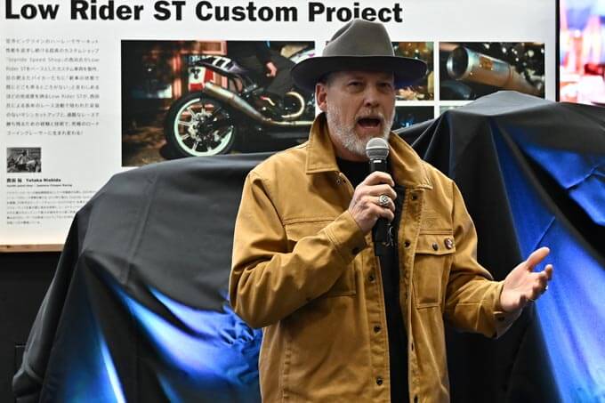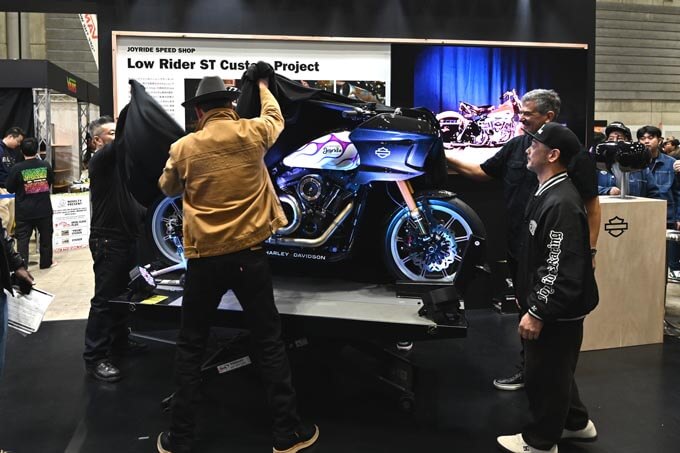 その後、ハーレーブースの目玉であるローライダーSTカスタムプロジェクトのマシンをアンベール!