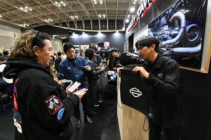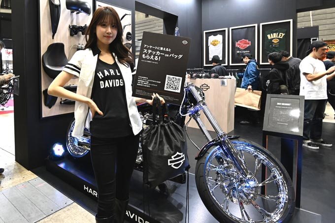 また、ハーレーダビッドソンブースではアンケートに答えるとステッカーorバッグがもらえるキャンペーンが行われ大盛況!