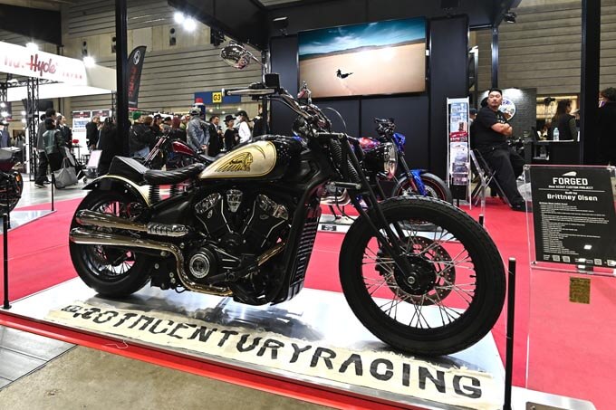 冒頭のライドインショーでも登場したニュースカウト カスタムプロジェクト”FORGED”のマシン。製作はBrittney Olsenでガーターフォークを筆頭にビンテージスタイルで仕上げられている。
