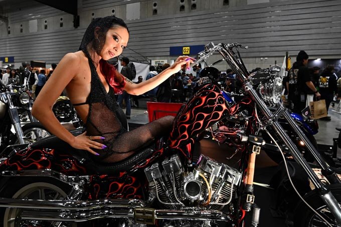 カスタムショーには欠かせない女性モデル。チョッパーとの相性抜群!