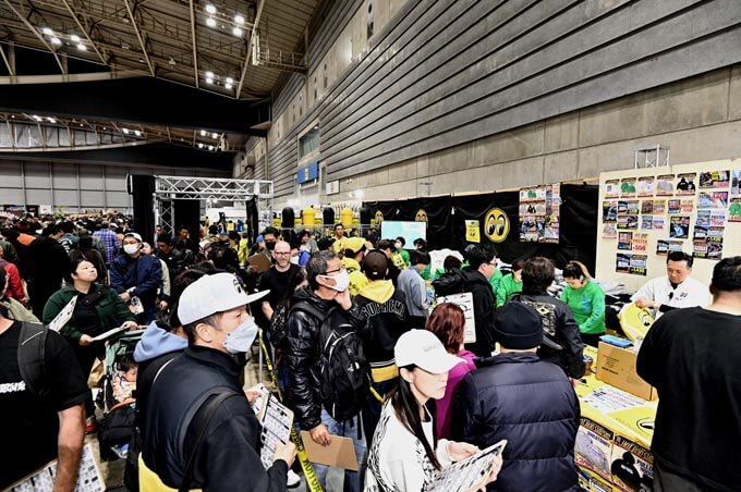 ここでベンダーブースの模様をご紹介! まずはムーンアイズのオフィシャルブースはご覧のように来場者で埋め尽くされていた。お目当はイベント限定グッズ!
