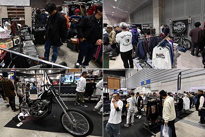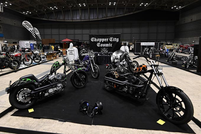 イベントの常連、鎌倉のシャフトシルバーワークスのブースに、PSYCHO WHEELS、オフィシャルスポンサーのVOLCOMブースには同ブランドアイコンを模したフューエルタンクを装備したショベルチョッパーが展示された。