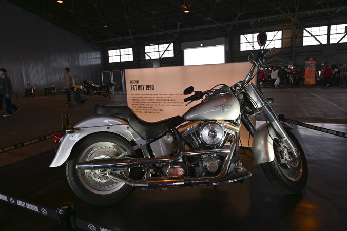 会場にはエボリューションエンジンを搭載した1990年式の初代ファットボーイが展示。ロッカーカバーのイエローがアイコニックな一台である。