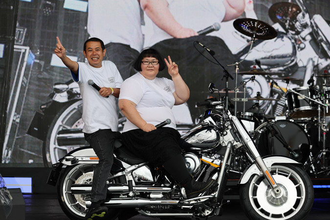 バイク好き芸人がプロデュースしたオリジナルメニューが提供される「ライダー芸人キッチン」に参加のノッチさんと、ファットボーイを愛車に持つ安藤なつさんがファットボーイ グレイゴーストに跨り記念撮影!