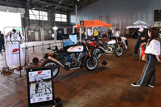 室内のモーターサイクルエリアではジョイライドスピードショップのレーサーが展示され、大きな注目を集めていた。