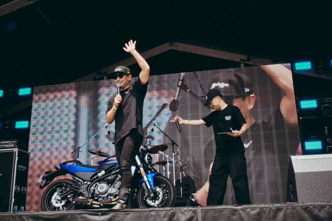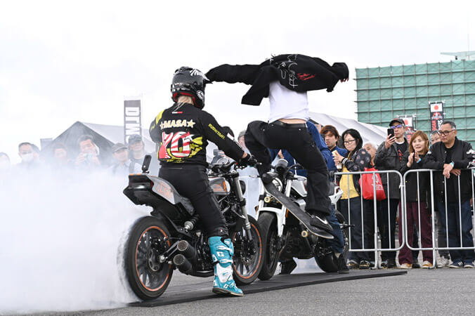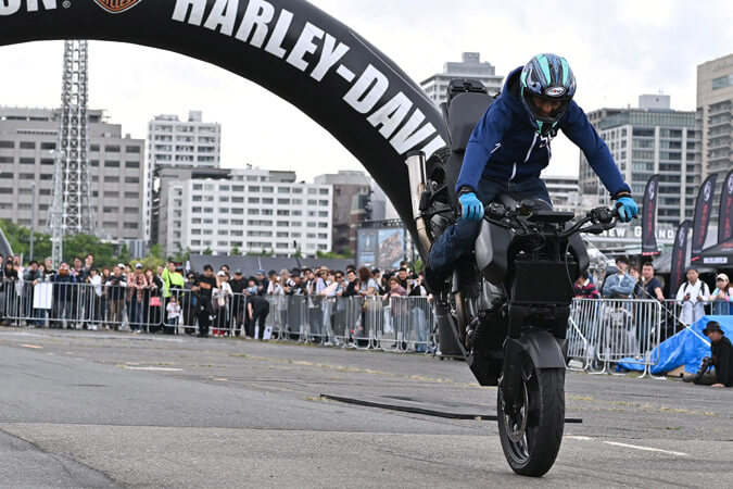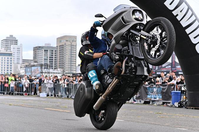大人気コンテンツのエクストリームライディングショー。プロスタントライダーの木下真輔さんがローライダーSTの二人乗りでウィリー!