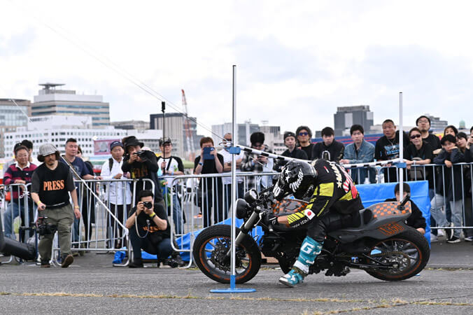 こちらはフラットトラックレーサーの大森雅俊選手のパフォーマンス。フラットトラックレーサーならではのスーパースライド!