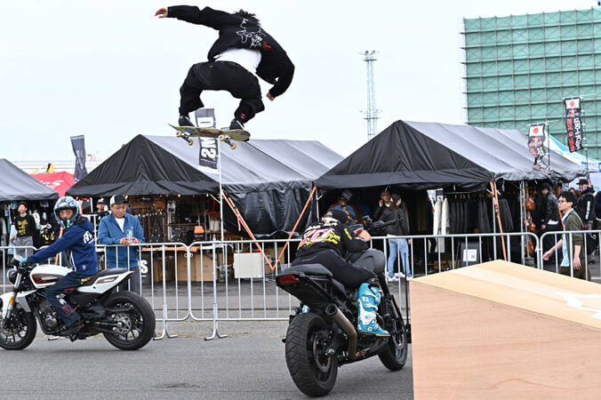スケートボーダー、森中一誠さんのパフォーマンス。今回のエクストリームライディングショーではバイクとスケートボードのコラボコンテンツが用意された。