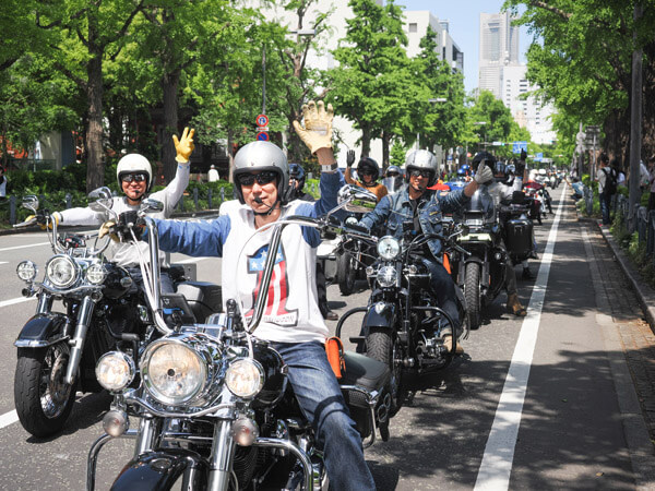 タレントの魔裟斗さんを先頭に山下公園通りをパレードするハーレーダビッドソン 横浜セーフティライド。最高の天気に恵まれパレードは大成功!