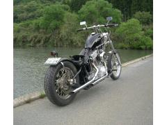 小さいタンク、フラットフェンダー、跳ね上ったトランペットマフラー、SUキャブ、8インチライザーのハンドルポジション、サドルシ-ト。
