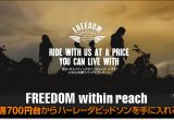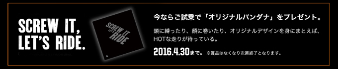 ハーレーダビッドソンは2016年4月30日(土)までに、ハーレー試乗キャンペーン「FREEDOM within reach」の専用サイトから予約し、全国の正規販売店で対象車両のストリート750/フォーティーエイト/アイアン883を試乗された方全員にオリジナルバンダナ(商品がなくなり次第終了)をプレゼント。150回ローンプランを利用すればストリート750なら週700円台から、フォーティーエイトなら週1400円台から、アイアン883なら週1000円台からの支払いでOK。ハーレーダビッドソンのオーナーになることは想像以上に簡単なことと言える。