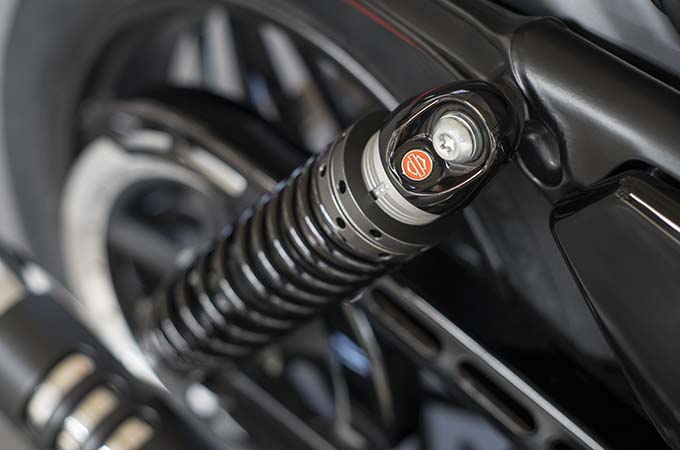 フロントサスペンションには、新開発のプレミアムライド・カートリッジ式43mm倒立フォークを採用。リアサスペンションは、プリロード調整付き専用プレミアムライド・エマルジョンショック。サスペンショントラベルは、フロント4.5インチ/リア3.2インチと、スポーツスター史上最大となっている。